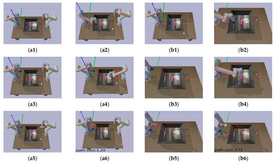 The image depicts a comparison of the movement paths when executing tasks with a single arm and dual arms. The (a1–a6) illustrates the movement path of the dual arms, while the (b1–b6) represents the movement path of the single arm. This experiment serves as an illustrative example of a single trial selected from the pool of 100 conducted trials.