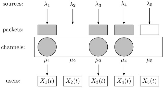 Figure 1 represents a system with channels and users in a slot where two packets from sources 1 and 3 have been generated. Only two channels can be allocated, which is indicated with gray filling. Figure 2 shows a snapshot of the same system with all channels allocated in a slot, as there are at least as many packets available as channels. Yet, the packet from source 5 will be lost, as it cannot be transmitted in the slot.