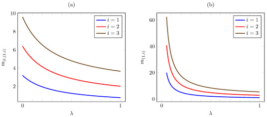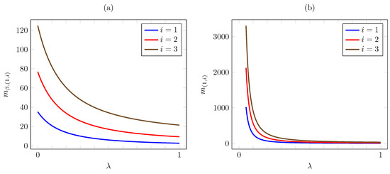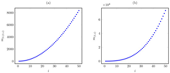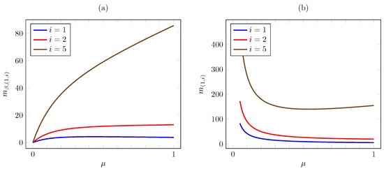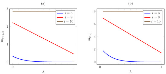 Hence, for , both indices and decrease with whenever , i.e., for , and increase with for sufficiently low values, in particular for . In contrast, for , both indices increase linearly in . Such behavior is illustrated in Figure 11.
