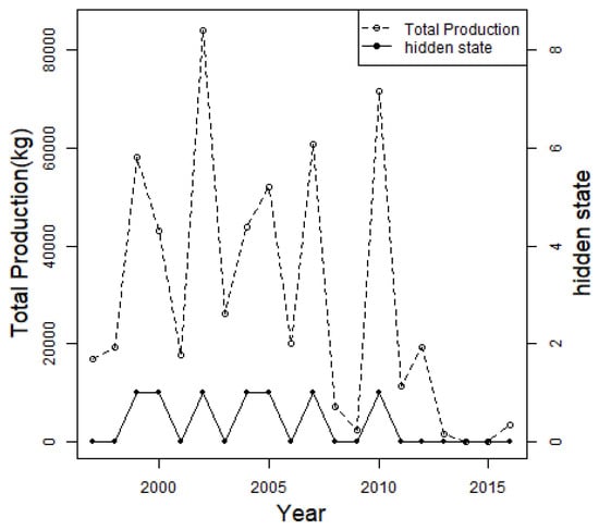 For a Bayesian analysis for the proposed HMM based on logistic regression, two parallel chains are used to check the convergence of the chain. After generating 35,000 samples, the initial 15,000 samples are discarded to eliminate the influence on the initial value, then 1000 samples are extracted by selecting every 20th samples to eliminate the autocorrelation. Gelman–Rubin statistics (G-R) are also checked (Gilks et al. [16]). First, let us look at the sequence of hidden states, , corresponding to the matsutake production (see Figure 1). The dashed line represents the annual matsutake mushroom production, and the solid line shows the year hidden state corresponding to the annual matsutake mushroom production. When , it means a lean year, and when , it means a bumper year. Second, let us take a look at the logistic parameters, . In a logistic regression based on the hidden Markov model (HMM), we use the hidden state in each year as the dependent variable of the logistic regression model to identify the meteorological factors that indirectly explain the variation in matsutake mushroom production (see Table 6). As a result of the analysis, four variables are found to be significant. The analysis shows that the total precipitation in August and the mean ground temperature in May are additional variables that affect matsutake mushroom production, compared to the previous model. In addition, there is a significant shift in the transition probability depending on whether the previous year was a lean year or a bumper year.