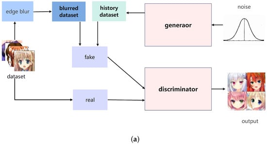 To create a database of edge-blurred images for training, we employed Canny edge detection to outline image edges and applied Gaussian blur to them. This database was then utilized to train the discriminator. The primary goal of this approach was to compel the model to avoid generating images with blurry edges, resulting in anime faces with significantly improved clarity. The algorithm of Edge Blur is shown in Algorithm 1 as pseudo code. An example of Edge Blur is shown in Figure 2a,b.