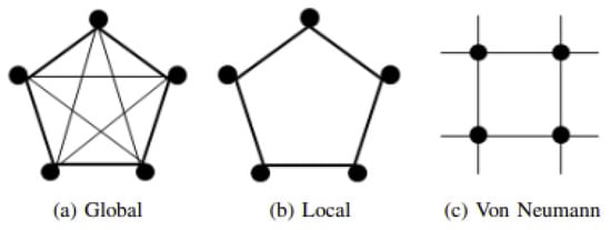 Initially, PSO works best with small population sizes. However, modifications and upgrades by researchers have made PSO efficient for large populations and multimodal problems. PSO works better with different population sizes depending on the given problem [32]. In PSO, the social iteration within the population is one of the key factors of the algorithm. The population has a communication structure among particles that enables them to collectively share search space experiences, aiming to solve complex problems and improve population diversity. This social network for information exchange is called topology. PSO has three commonly used topologies, as shown in Figure 1 [33].
