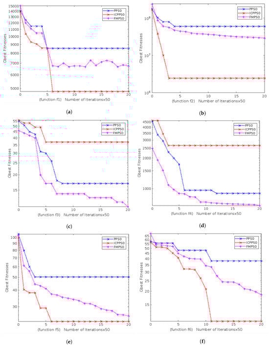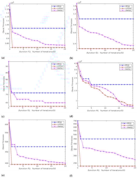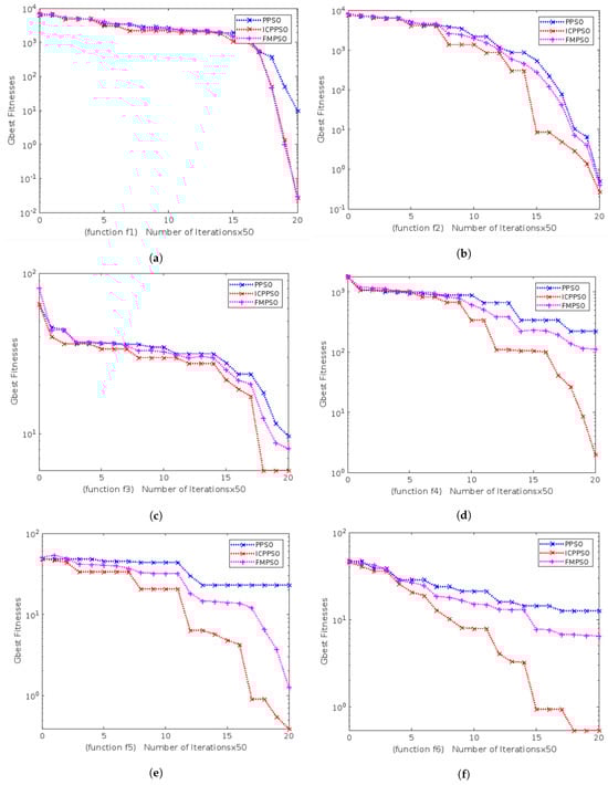 Figure 3 shows the convergence graphs of all algorithms for functions to , respectively. These graphs were generated using a population size of 100 and a dimension of 30. Figure 3a shows that for the initial iterations, the performance of all the algorithms was similar; however, the performance of FMPSO and the proposed ICPPSO improved as the number of iterations increased. The performance of the proposed ICPPSO was better for functions , , , and compared to both FMPSO and PPSO. Moreover, the performance of FMPSO was superior to that of PPSO, as indicated by the results.