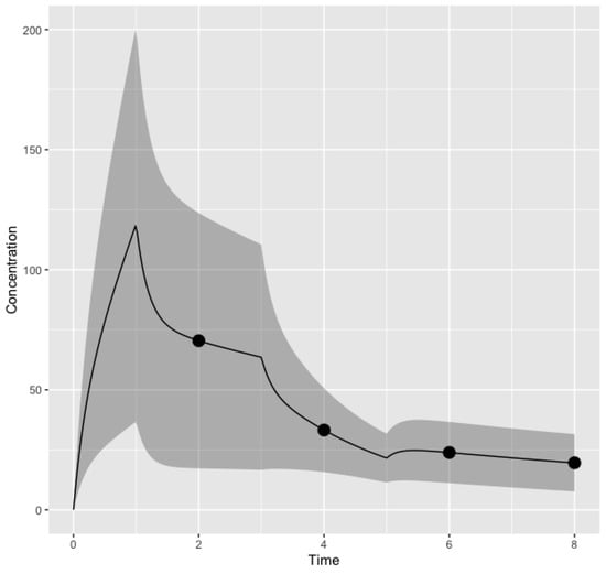 Figure 2. The plot shows the predicted central compartment drug concentrations (mg/L) with sampling time points at 2, 4, 6, and 8 for Application 2.