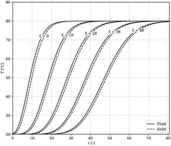 After inverse Fourier transformation, these relations give the desired solid and fluid temperatures and . The results for the reduced solid and fluid temperatures are given in Figure 1. We recognize the typical diffusive behaviour of the solid and the fluid temperatures subject to Dirichlet and Neumann boundary conditions, respectively. The reduced solid temperature is zero initially and is then heated up by the arriving fluid. The hot fluid is at reduced temperature 1, initially, and is cooled down by heat transfer to the solid. Solid and fluid temperatures approach each other for larger . A good measure for this is the fluid temperature at . We have that , which rapidly changes to zero as increases.