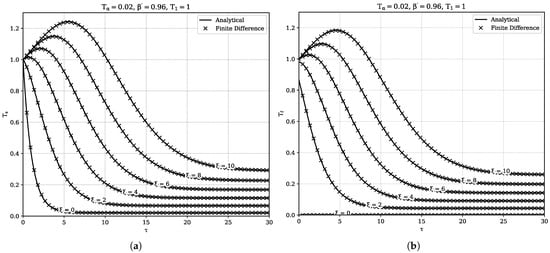 -series of the reduced solid (a) and fluid (b) temperatures evaluated at several -coordinates, as calculated by the analytical solution and the FD model. A high degree of agreement is noted between the analytical and numerical solutions. For the chosen and , the maximum error is 6%.