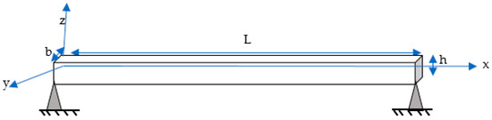As illustrated in Figure 1, we have taken a visco-beam with length , width , and thickness in Cartesian coordinates. Let the beam’s x-axis serve as its axis. Its two endpoints should be at and , and the origin should be located in the middle of the end at . Consider that beam is free from any stress and strain and is at a uniform temperature in a stable position. Additionally, the upper and bottom surfaces of the beam do not experience any heat transfer; therefore,