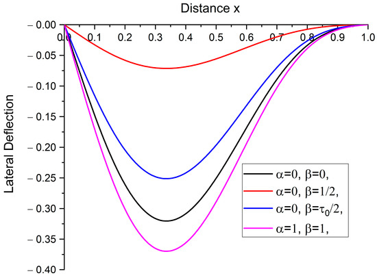 Figure 2 demonstrates the variation in the lateral deflection w with respect to the length of the visco-beam for different modes of kernel function of MDD based on the values of . As both ends of the visco-beam are simply supported, from the graph, it can be observed that the lateral deflection at and is zero, which satisfies the boundary conditions. Moreover, for the kernel function of MDD, the visco-beam shows the minimum variation as compared to when the value of the kernel function is . Therefore, the memory effect is clearly noticeable from the graph.