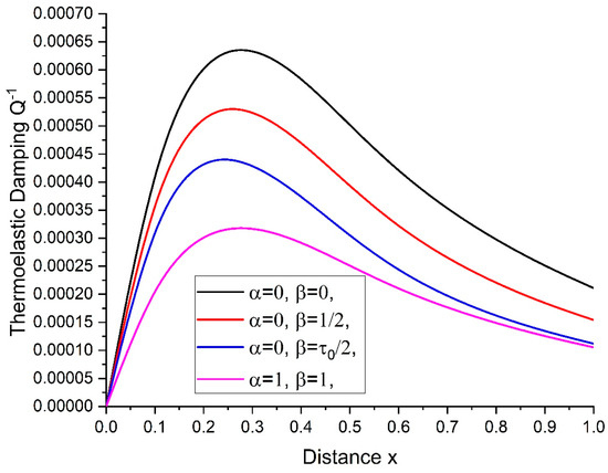 Figure 5 demonstrates the variations in the thermoelastic damping with the length x for different modes of kernel function of MDD based on the values of . For the kernel function of MDD, the visco-beam shows the maximum variation in thermoelastic damping, whereas thermoelastic damping is at its minimum when the value of kernel function is Therefore, the memory effect is clearly noticeable from the graph.