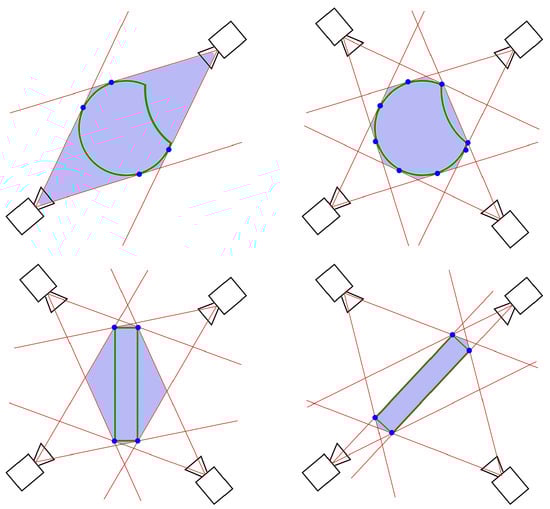 Even in these extreme scenarios, the point selection approach effectively identifies potential points along the epipolar line that would minimize the difference relative to the reference. This 2D approach can be seamlessly extended to the 3D case. Moreover, while the 2D scenario yields only 2 points per camera and object, the 3D case obtains one point per silhouette border, which could theoretically be infinite. However, in practical implementation, this is constrained to one point per pixel along the border direction.