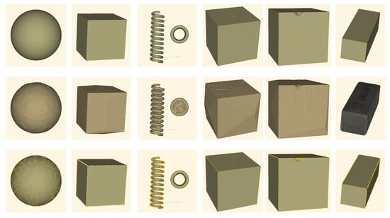While scaling serves as an insightful test showcasing the capabilities of BCPS, it’s crucial to acknowledge that defects encountered in industrial settings encompass various forms of volumetric deformations beyond mere scaling. This second experiment specifically aims to simulate random measurable defects by adding and subtracting volume from the objects. The objective is to assess the accuracy of the optimal point selection in handling such deformations. It’s worth noting that both transformations were constrained to create “convex” objects, ensuring they can be accurately reconstructed using a convex-hull technique, with a maximum defect distance of 3 mm.