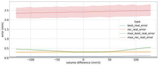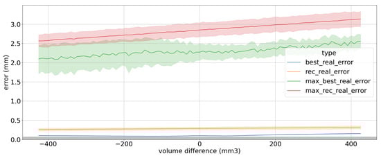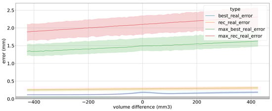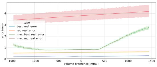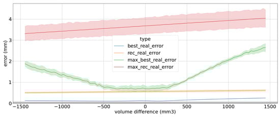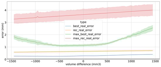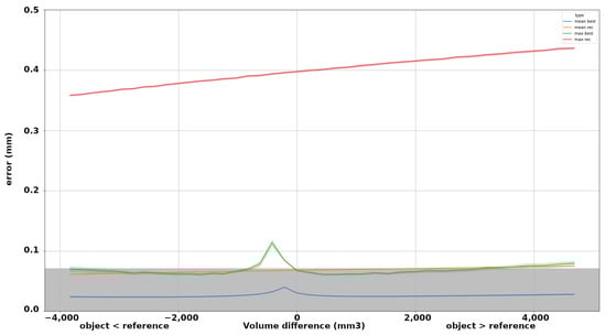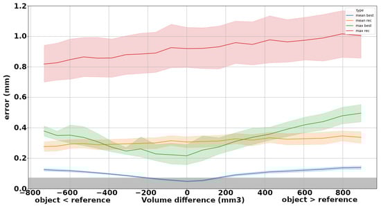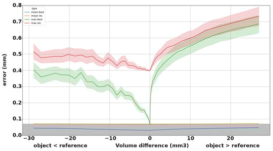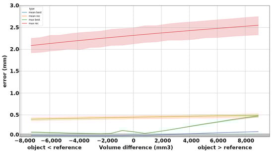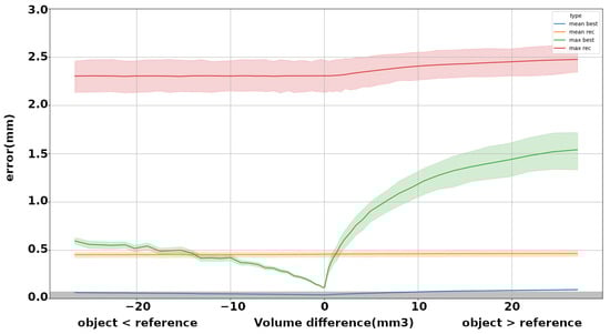 Figure 7 illustrates the results of the mean and maximum error for a simulated 30 mm cube. The errors were computed within a 95% confidence interval, as the size of synthetic bulges may vary depending on the object’s rotation. As evident, both mean and maximum reconstruction errors (represented by the orange and red lines, respectively) increase as the size of the object grows. This relationship can be attributed to the fact that the size of synthetic bulges is directly linked to the object’s size, resulting in larger errors for larger objects.