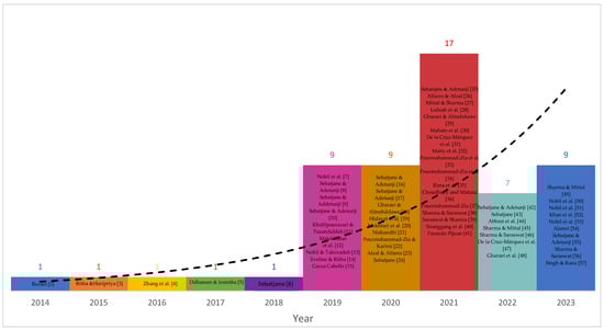 Since Harris [1] developed the concept of economic order quantity (EOQ) in the early 1900s, both industry and academia have had a keen interest in the development of various inventory models and their uses. Therefore, extensive research has been conducted in the field of inventory lot sizing. The area within inventory models that focuses on items capable of growing (known as growing items) is still relatively new and continues to provide valuable information to inventory managers across several industry sectors. Figure 1 shows the number of publications related to growing items produced between 2014 and 2022. The importance of growing items was first recognized when Rezaei [2] introduced a mathematical model to optimize the inventory management of growing items, such as poultry. Rezaei’s model determines the ideal order quantity for newborn animals and the optimal day for their slaughter while considering the annual demand.