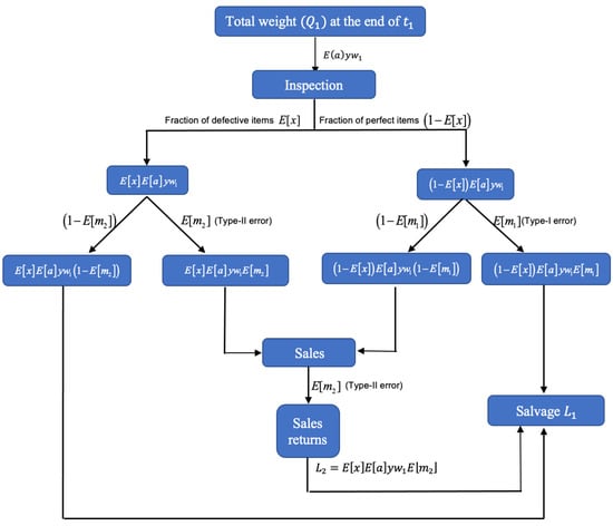 The manufacturer’s decision between full inspection and sampling inspection plays a significant role in determining the economic production lot size for items with imperfect quality and inspection errors. Bose and Guha [69] proposed an economic production lot sizing under imperfect quality, on-line inspection, and inspection errors. Unlike previous research, Rizky et al. [70] devised an integrated inventory model that considers controllable lead time, defective items, errors in inspection, and variable lead time, all while considering sustainability factors. Taghipour et al. [71] conducted a study on the production-inventory-marketing model within a two-stage manufacturer-retailer supply chain. The study focused on the vendor-managed inventory (VMI) policy and considered a price-sensitive demand. The model accounted for imperfect production at the manufacturer’s stage and an inspection process at the retailer’s stage that involved Type-I and Type-II errors. Zhu [72] conducted a study on the optimal promotional pricing, special order quantity, and screening rate for defective items at the retailer level in the presence of a temporary price reduction. The study considered both Type-I and Type-II inspection errors as factors to be incorporated into the analysis. Similarly, Asadkhani et al. [73] formulated four EOQ models that account for different types of imperfect quality items, including salvage, repairable, scrap, and reject items. They also considered learning from inspection errors in their models. The fraction of imperfect items is assumed to be a random variable. To identify and classify these items, the system employs a full inspection process that may involve Type-I and Type-II errors.