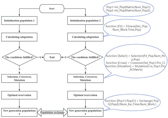 The traditional genetic algorithm basically uses an initial population to start the operation, crossover, and genetic mutations; this method is simple and easy to implement, but there are problems such as premature convergence. For this problem, a kind of multiple population genetic algorithm (MPGA) can be used to replace the standard genetic algorithm (SGA). In this paper, a dual population population genetic algorithm is used to solve the production line balance problem in the curtain wall production line. The general flow of the dual population genetic algorithm is indicated in Figure 2.