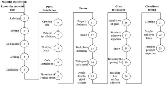 The production of curtain walls is a comprehensive processing process. From feeding to finished products, curtain wall products need to go through a series of processes such as processing and assembly []. The general process of curtain wall production includes the following steps. Step 1 is the preliminary preparation work: preparing production task books, editing processing processes, reviewing process documents, formulating production plans, arranging production, and receiving materials. Step 2 is machining: cutting according to the assembly sequence of the unit baffle. The cutting process includes sawing, end milling, milling, drilling, etc. Step 3 is the assembly, including the installation of components, assembly of frames, installation of glass, and the injection of structural adhesive. Step 4 is cleaning and maintenance, carrying out an inspection and storing after passing the inspection []. Due to the unique nature of the curtain wall structure, there is a significant difference in the operating time of each processing process, which leads to the emergence of bottleneck workstations. Due to the varying levels of skill proficiency among workers, there is no unified standard for the operation time of each process, resulting in a low level of intelligence in the production line. Both have led to a low balance rate in the curtain wall production line.