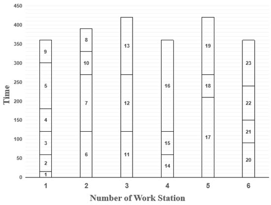 In order to compare the optimization scheme more clearly according to Table 1, the production line balancing rate and balanced index changes are shown in Figure 5. It can be seen in Figure 5 that, when the workstation , the production line balance rate is at its maximum and the equalization index is at its minimum, but the production beat is not at its minimum. Therefore, the optimal solution is when the workstation . The scheme diagram is shown in Figure 6.