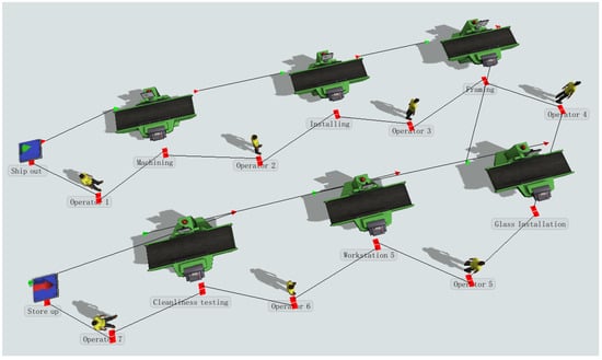 In order to better verify the effect of dividing the workstations into six, the simulation model is built in Flexsim, where the workstations are handled with a composite processor and each workstation is assigned an operator, as shown in Figure 7. After setting the parameters, the simulation model is run; the results obtained from the run are shown in Table 2.