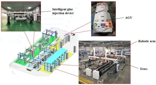 At the same time, in order to solve the problem of the low automation of the existing curtain wall factory, an intelligent curtain wall production factory was designed while the optimization results were applied to the designed intelligent curtain wall production factory. The smart factory is divided into three areas, namely, Area A (blue), the machine processing area, Area B (yellow), the warehouse and logistics distribution area, and Area C, the unit assembly area. In Zone A, an automated column production line is set up to complete the processing of aluminum profiles and the assembly of components. Area B transports raw materials for aluminum profiles from the warehouse to Area A and other raw materials to Area C via AGV. Area C is built with a truss manipulator, a six-degrees-of-freedom manipulator, and an intelligent glue injection unit to complete the work of framing, glass installation, glue injection, etc., as shown in Figure 8.