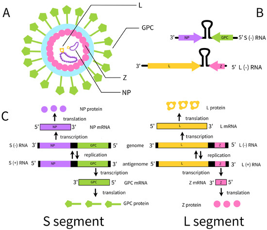 - Lee, K.J.; Novella, I.S.; Teng, M.N.; Oldstone, M.B.; de la Torre, J.C. NP and L proteins of lymphocytic choriomeningitis virus (LCMV) are sufficient for efficient transcription and replication of LCMV genomic RNA analogs. J. Virol. 2000, 74, 3470–3477. [Google Scholar] [CrossRef] [PubMed]