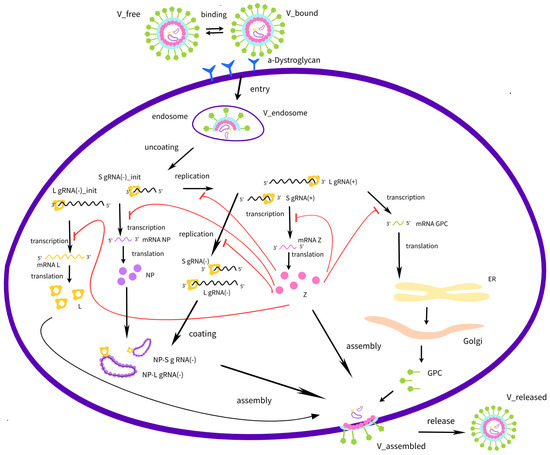 The LCMV life cycle starts with the infection of target cells. For this, the virion surface GP-1 protein interacts with cell surface -DG that is mainly expressed on dendritic cells (DCs) [30,31,32]. The virion then enters target cells via non-coated vesicles that direct it to late endosomes [33,34,35]. This internalization process is cholesterol-dependent but clathrin-independent. At the late endosomes, a pH-dependent fusion between virion and endosome membranes occurs which releases virus genomic RNAs and L proteins into the cytoplasm. The L protein then initiates virus genome replication and viral mRNA generation. Subsequent translation of NP, L and Z mRNAs occurs in the cytoplasm while GPC mRNA is translated at the endoplasmic reticulum. The precursor GPC protein is post-translationally cleaved in the Golgi apparatus into the stable signal peptide SSP and the glycoproteins GP-1 and GP-2. The increase in Z protein concentration leads to the inhibition of the L polymerase and a shift towards virus assembly and release. The genomic RNAs are coated with NP proteins and transported with GP, Z and L proteins to the cell membrane, where virions are assembled and released from the infected cell by budding. The overall scheme of the intracellular LCMV replication stages is presented in Figure 2. The scheme is used to formulate the mathematical model of the LCMV life cycle.