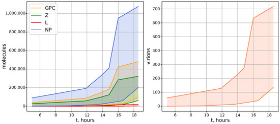 Generalized kinetics of LCMV growth in an infected cell. Estimates of the number of the LCMV proteins (left) and released virions (right) as a function of time after infection derived from [18,19,20,34,36,37,38,39,40,41]. The shaded areas represent observed ranges of abundances.