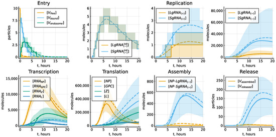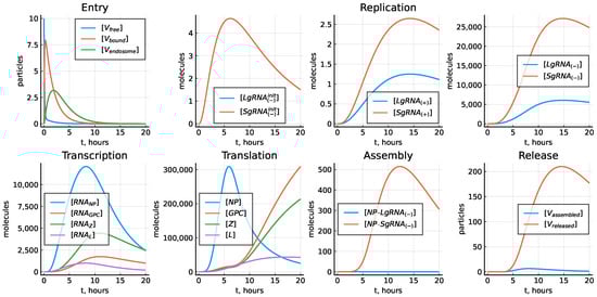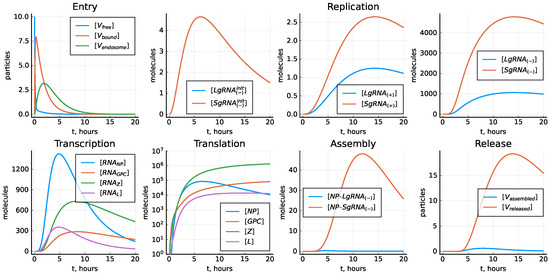 The LCMV life cycle shown in Figure 2 suggests the following set of time-dependent variables listed in Table 2. The ordinary differential equations (ODEs) are used to model the key replication steps, which include: (a) cell entry, (b) replication, (c) transcription, (d) translation of proteins, and (e) assembly and release of virions. The system of equations was formulated using the basic principles of chemical kinetics, especially the mass action law and Michaelis–Menten parameterization for describing the assembly, coating, replication and transcription processes.