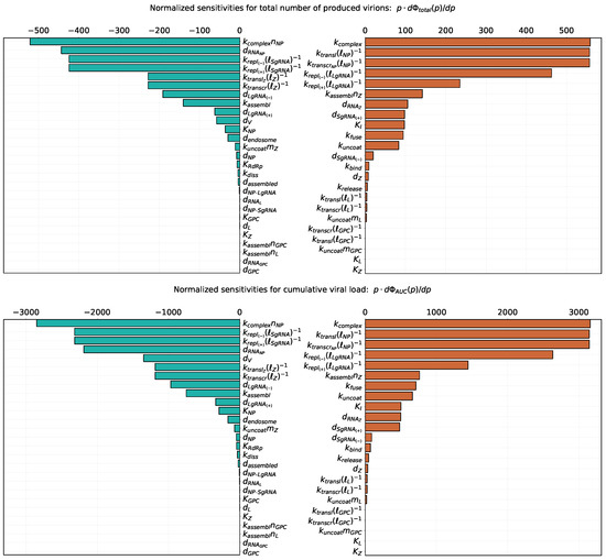 To examine the relationship between the net production of LCMV and the parameters of the intracellular biochemical reactions, we used the sensitivity analysis. Two characteristics of the virus net growth were considered: (i) The cumulative number of released virions and (ii) the total number of new virions secreted by an infected cell during time T (20 h) from the beginning of infection (thus, disregarding their degradation). The first one is denoted as and is calculated as an area under the model solution component curve, i.e., the integral of the solution component with respect to the time variable t on an interval . The second characteristic is denoted and is calculated as the integral of the release rate of assembled virions . Computationally, we follow our previous approach [47] to analyse the local sensitivity of the total number of released virions, i.e., functional , and the total number of produced virions, functional , for h. The local sensitivity analysis was performed via the adjoint equations method implemented in Julia using the DiffEqSensitivity library. To compare contributions of the biochemical processes, the sensitivity coefficients were multiplied by the corresponding parameter values. The results were ranked by decreasing absolute values and visualized as histograms (separately for negative and positive derivatives).