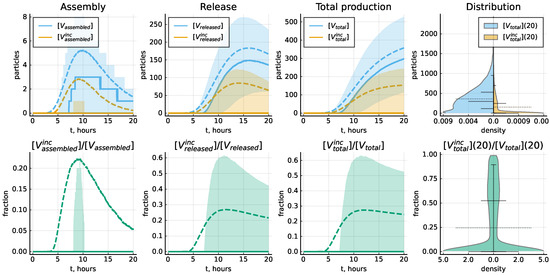 The kinetics of complete and incomplete virion production. Top panel shows the number of assembled and released virions and total number of produced virions as function of time, as well as the distribution of the total number of complete and incomplete virions throughout 20 h. Bottom panel shows the fraction of incomplete virions as function of time, as well as the distribution of the total number of complete and incomplete virions throughout 20 h. Solid lines indicate the median values, dashed lines—mean values and filled areas—interquantile ranges. Violin plots indicate the estimated probability density, as well as the mean values (dashed), median values and the following percentiles: 0.05, 0.25, 0.75 and 0.95. Baseline set of parameters from Table 3 is considered.