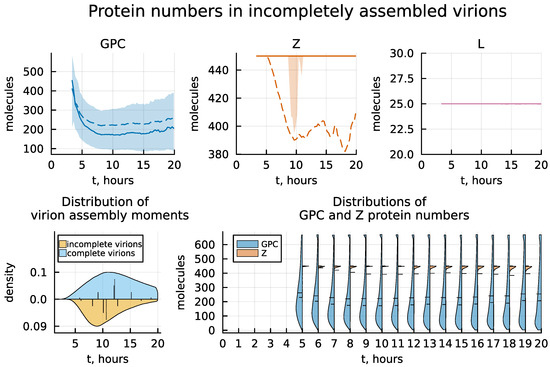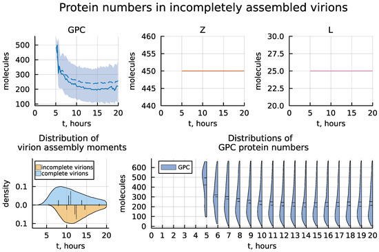 The kinetics of protein number distribution in incomplete virions. Top panel shows the number of GPC, Z and L proteins in the assembled incomplete virions as function of time. Bottom panel shows the distribution of virion assembly moments for complete and incomplete particles, as well as evolution of the distributions of GPC protein numbers in incompletely assembled virions. Solid lines indicate the median values, dashed lines—mean values and filled areas—interquantile ranges. Violin plots indicate the estimated probability density, as well as the mean values (dashed), median values and the following percentiles: 0.05, 0.25, 0.75 and 0.95. Modified set of parameters with the transcription and translation rates of all proteins being the same is considered.