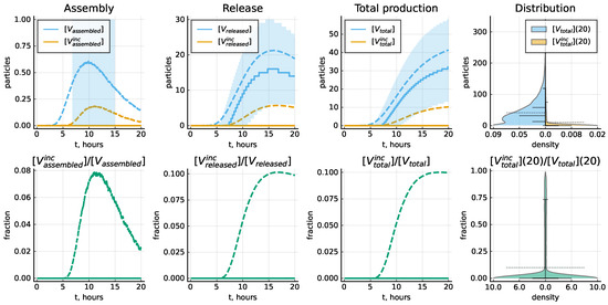 The kinetics of complete and incomplete virion production. Top panel shows the number of assembled, released virions and total number of produced virions as function of time, as well as the distribution of the total number of complete and incomplete virions throughout 20 h. Bottom panel shows the fraction of incomplete virions as function of time, as well as the distribution of the total number of complete and incomplete virions throughout 20 h. Solid lines indicate the median values, dashed lines—mean values and filled areas—interquantile ranges. Violin plots indicate the estimated probability density, as well as the mean values (dashed), median values and the following percentiles: 0.05, 0.25, 0.75 and 0.95. Modified set of parameters with the transcription and translation rates of all proteins being the same is considered.