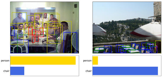 Each image has a different number of bounding boxes for each class. For example, the number of bounding boxes (yellow) for a person may be high, while the number of bounding boxes (blue) for a chair may be low (left), or vice versa (right). Images are taken from the Pascal Visual Object Classes (VOC) 2012 dataset.