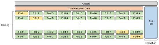 The 10-fold cross-validation split method for splitting the training, validation, and test data. The yellow box represents the fold used for validation, and the green boxes represent the fold used for training.