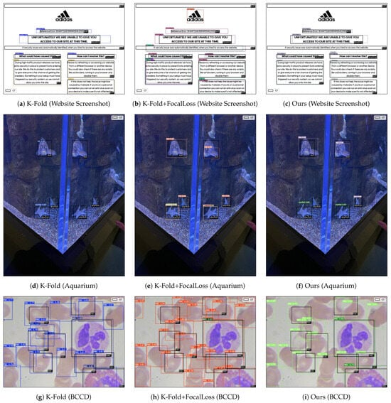 In Figure 4, object detection results targeting private datasets are shown. When the k-fold method was applied to the website screenshot dataset, bounding box regression errors occurred. Using k-fold and FocalLoss together led to the existence of multi-class overlap; however, the bounding box regression errors were reduced compared to when only k-fold was used. When our methodology was applied, both bounding box regression errors and multi-class overlap were improved compared to other existing methods.