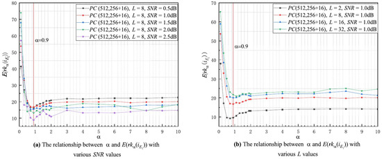In this subsection, the experiments on the relationship between and are carried out under different , L, N, and R conditions according to the strategy given in Section 3.3 and the relationship curves are shown in Figure 4a–d, respectively. In Figure 4a, all of the curves gradually decrease as increases, and they reach their minimum value at around , after which the curves stabilize. This suggests that the minimum value of is not impacted by the values of , and that the first erroneous decoded bit has the highest flipping priority at under any condition. In Figure 4b, all the curves decrease with increasing and reach a minimum value around , and they gradually converge as continues to increase. This indicates that the minimum value of is also not affected by the value of L, and the first erroneous decoded bit obtains the highest flipping priority around with any L. Moreover, the curves in Figure 4c,d have approximately the same trend as those in Figure 4a,b, and with the exception of a few curves, they all reach their minimum value at with different N and R values. Therefore, we conclude that the minimum value of is independent of N, R, L, and SNR; i.e., the minimum value of does not change as the decoding conditions change. Based on the above analysis, we can conclude that the achieves its minimum value at , so .
