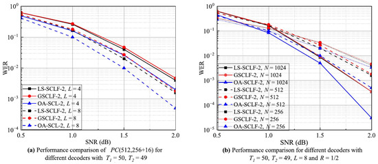 Figure 6a–c show the WER performance of LS-SCLF-2 decoding and decoding for various L, N, and R values. From Figure 6a, it can be seen that the WER values of the decoder are lower than those of the decoder in the 1.0 dB regions for both and . From Figure 6b, it can be seen that the WER curves of the decoder and the decoder are basically the same at and , while the WER values of the decoder are slightly lower than those of the decoder at . As can be seen in Figure 6c, the WER curves of the decoder are lower than those of the decoder under different R values, and the difference between them gradually increases with increasing . In summary, the overall error correction performance of the decoder is higher than that of the decoder, and the advantage of the decoder is more obvious in the region of 1.0 dB. Figure 7 shows the comparison of the error correction performance of different decoders at , where , , . Analyzing Figure 7, we can come to a similar conclusion as in Figure 5 and Figure 6; i.e., the error correction performance of the LS-SCLF-3 decoder is slightly better than that of the decoder under different decoding conditions.