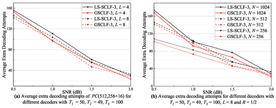 As shown in Figure 9a, the average extra decoding attempts for the LS-SCLF-2 decoder are marginally greater than for the decoder at varying L conditions. The discrepancy between the two is more noticeable at , but it does not exceed 2 at the most. As shown in Figure 9b, the average extra decoding attempts of the LS-SCLF-2 decoder and the decoder are nearly equal under varying N conditions, and the six curves converge around dB. However, the difference between the average extra decoding attempts of the two decoder marginally rises in the 1.5 dB regions in comparison with other regions. From Figure 9c, we can see that the extra decoding attempts of both decoders rises considerably as R increases. For R values of one-third, the average extra decoding attempts for the LS-SCLF-2 decoder and the decoder are almost identical, but for values greater than one-half, the average extra decoding attempts of the LS-SCLF-2 decoder are marginally larger than those of the decoder. The analysis in Figure 9 demonstrates that the decoding complexity of the LS-SCLF-2 decoder is slightly greater than that of the decoder. In Figure 10, we can also observe a similar phenomenon as in Figure 9; i.e., when , the average number of extra decoding attempts of the LS-SCLF decoder is higher than those of the GSCLF decoding under different conditions, indicating that the LS-SCLF decoder has a higher average extra decoding complexity compared to the GSCLF decoder. However, the difference is that the gap between the average extra decoding attempts of the two decoders is much larger with ; e.g., in Figure 10b, when , the gap between them can reach more than 10 in the regions of 1.0 dB.