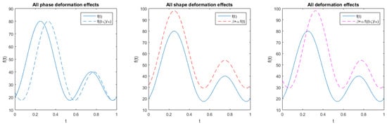 which can be realized as a special case of the general amplitude-phase deformation model (see, e.g., []) considering and with denoting the deformation parameters related to the scale and location of the amplitude deformation process, while denotes the parameters affecting the scale and location of the phase deformation process (please see Figure 1 for an illustration of the deformation model’s characteristics). In this perspective, the space of profiles is identified by the following subset of
