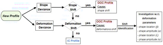 Combining the two shift detection schemes described in (20) and (25) results in an effective tool for both detecting and explaining potential shifts for profiles which can be captured by the parameterization offered by the shape-invariant model. At the first step, the observed profile’s underlying shape is checked, if it is sufficiently close to the estimated typical pattern (). If a shift is detected at this step, then the profile is considered as an out of control (OOC) one, at least under the shape-invariant model’s explainability. If no shift is detected, then the shape-invariant model can be considered a valid approach and the scheme proceeds with studying the profile’s amplitude-phase deformation characteristics. At this step, the second monitoring approach is applied and determines whether the aggregate deformation effect leads to an IC status for the examined profile or not. If no shift is detected, the profile is considered as an IC one, while in the opposite case, a further investigation is performed on which deformation attributes led to the shift by constructing typical EWMA charts on each one of the deformation parameter in . A graphical representation of the monitoring procedure is illustrated in Figure 2 while the steps of the monitoring scheme are briefly described in Algorithm 2.