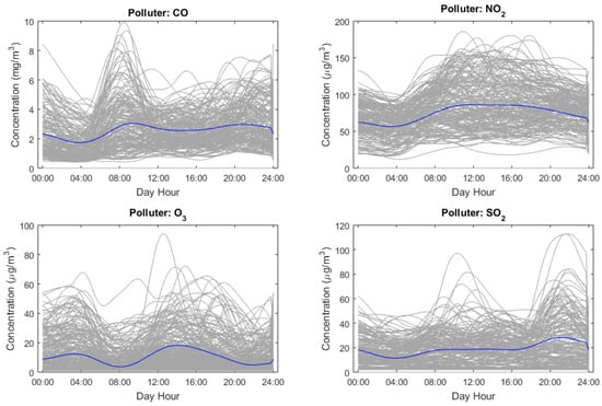 In this section, the presented methodology is implemented to analyze air pollution profiles in an area of the city of Athens. The discussed approach has been also previously tested with success through a number of simulation experiments with synthetic types of data. Since all the important aspects and capabilities of the method that have been displayed in the synthetic data experiments are fully observed through the air pollution case study without losing any part of the stress assessment of the approach, and taking into account (a) the better insights provided by a real-world example and (b) with the objective of keeping this paper concise, only the real-world example is illustrated. The functional modelling and shift detection approach presented in Section 3 is implemented in studying daily air pollution profiles in which measurements have been sampled by atmospheric pollution sensors from the area of Patission Street in Athens.