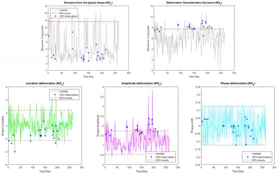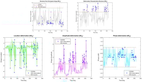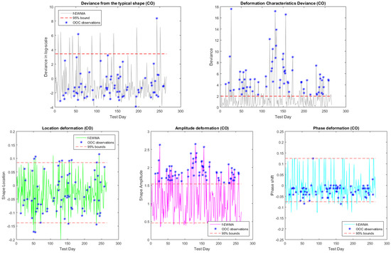 For the proper illustration and assessment of the presented methodology, air pollution profiles for pollutants from an area in the city of Athens were studied. The described modelling framework has been implemented to capture the typical intra-day patterns of the pollutants and the relevant distribution of the deformation features that characterize the acceptable deviance from the IC behavior. Next, the developed monitoring scheme was implemented for detecting shifts in the daily sampled profiles of the pollutants with success. In particular, the total accuracy in correctly identifying the status of the profiles varies between 83% and 96%. For the IC category, the percentage of true identification varies between 83% and 95%. Moreover, concerning the OOC category, for the three pollutants, all the OOC profiles were successfully identified with the exception of one pollutant where the percentage of true classification was about 78%. Although the percentages of correct identification are quite high in most cases, the monitoring scheme seems to present a more conservative behavior when characterizing profiles as IC leading to higher Type II errors, while Type I errors are almost zero. The higher Type II errors in these cases could be reduced by including more information in the monitoring task (e.g., take into account extra environmental quantities like temperature, humidity, etc.), or by the more careful modelling of the interdependencies concerning the deformation features within and across the different pollutants, or even by considering a different type of deformation model to SIM in case that the pollutant being studied provides quite different patterns which should still be considered as IC ones (e.g., by using landmark deformation models []). In any case, all the above directions can be considered extensions of the current framework and potential steps for future research.
