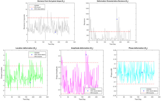 One may consider beginning the shift detection procedure by building typical EWMA charts on the obtained deformation parameters and then extending this chart for the deformation processes and the object . However, the nonlinearity of with respect to the parameters (particularly for the shape-invariant model with respect to the phase deformation parameters) does not allow for such a generalization. Notice that, assuming that the deformation functions are linear with respect to their parameters, e.g., , , although one may attempt to monitor the deformation functions separately, e.g., and , then the resulting chart for through does not coincide with the minimizer of Equation (21).