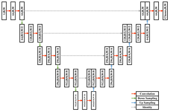 where represents a double convolution layer, the two connected layers of convolution operation, with each convolution operation including the convolution operation with a kernel size of , the BatchNormalization operation, and the activation operation; represents the down-sampling operation; represents the concatenation operation; represents the up-sampling operation; represents the convolution operation with a kernel size of ; and represents the number of categories.