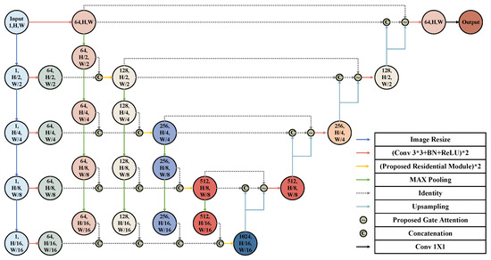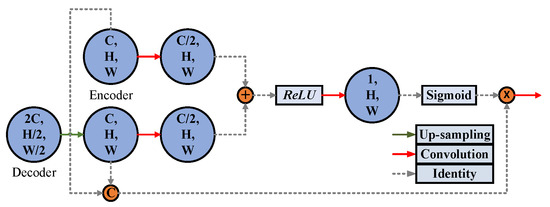 where represents the convolution operation; m is the size of the convolution kernel; n represents the number of channels in the output and uses different convolution kernels to calculate two different attention weight matrices and ; represents the up-sampling operation, where represents the double convolution layer and represents the two connected layers of convolution operation, with each convolution operation including the convolution operation with a kernel size of , the BatchNormalization operation, and the activation operation; represents the concatenation operation; is the ReLU activation function; and represents the Sigmoid activation function.