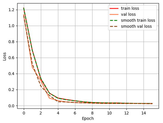 The software composition of the experimental platform is as follows: Windows 11 operating system, Python 3.7 programming language, and pytorch11.2 software. The hardware platform is as follows: Intel i5-12600K CPU, 16G DDR4 4000 MHz memory, and single Nvidia 2080Ti 11G GPU. In the training process of the neural network, the parameters were optimized by an Adam optimizer, the learning rate was set from 10−4 to 10−6 by the cosine annealing rate, and the batch-size was set to 8. Twenty epochs were trained, and the weights with the smallest losses on the validation set were selected as the optimal weights. In addition, random rotation, translation, and local deformation were used to process the training set to enhance the input diversity of the data. The loss metrics during the training process are shown in Figure 7.