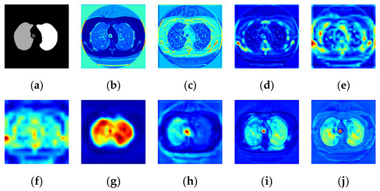 Heat map analysis of MCRAU-Net characteristics at each level. (a) Gold Standard. (b) Feature visualization results of Encoder layer 1. (c) Feature visualization results of Encoder layer 2. (d) Feature visualization results of Encoder layer 3. (e) Feature visualization results of Encoder layer 4. (f) Feature visualization results of Encoder layer 5. (g) Feature visualization results of Decoder layer 4. (h) Feature visualization results of Decoder layer 3. (i) Feature visualization results of Decoder layer 2. (j) Feature visualization results of Decoder layer 1.
