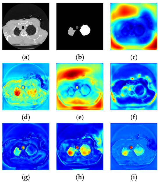 Heatmap analysis of the last layer of features for each algorithm. (a) Original CT images. (b) Gold Standard. (c) Feature visualization results of Vgg16-UNet. (d) Feature visualization results of U-Net. (e) Feature visualization results of Resnet50-UNet. (f) Feature visualization results of UneXt. (g) Feature visualization results of TransUNet. (h) Feature visualization results of UCTransNet. (i) Feature visualization results of MCRAU-Net.