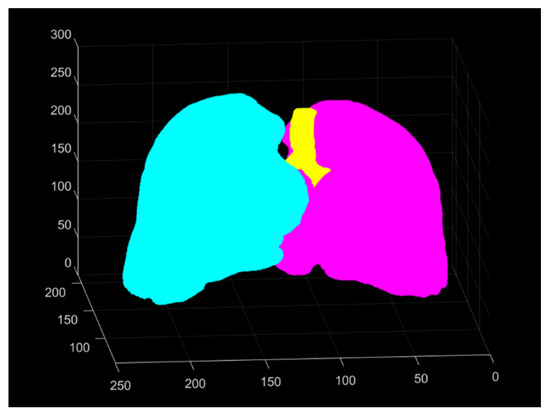 The results of the CT image segmentation and reconstruction. In the picture, the blue mask is the left lung, the purple mask is the right lung, and the yellow mark is the trachea.