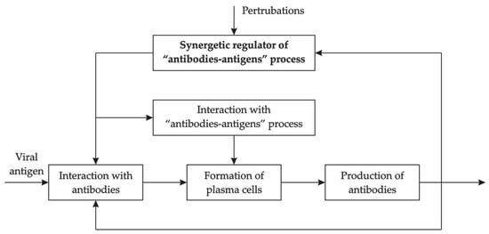 The immune response is a phenomenon underlying immunity; it consists of the reaction of the immune system of an organism to the penetration of an antigen (an organism recognized as a foreign body). In order to define the control problem (Figure 1), let us take an extension of the base mathematical model of an antiviral immune response [17], where good agreement has been achieved between the laboratory data and the model solutions in terms of their application to the mechanisms of chronification during viral hepatitis B. This model allows the analysis of the antiviral cellular immune response, the antiviral humoral immune response, and the antiviral immune response in conditions of immunodeficiency.