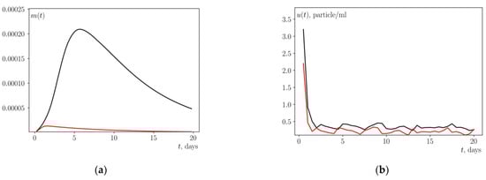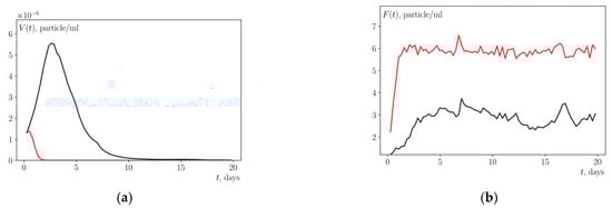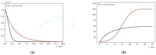 In (1) and (2), the equations numbered 1–3 characterize the processes in the target organ, the equations numbered 4–6 are responsible for the dynamics of the T-cell immune response, and the other equations model the humoral immune response (via antibodies) [16,17,24], which could be influenced by the changing variable, F(t) (antibodies to the viral antigens).